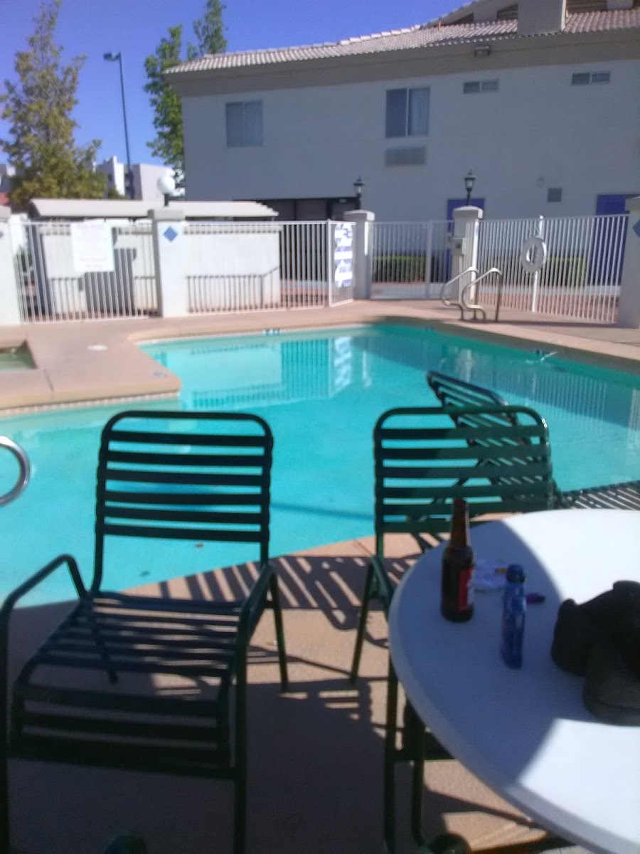 Awesome manager! A bunch of us showed up an hour before check-in time and the rooms weren't ready due to washing machine issues (totally understandable; they weren't supposed to be ready for an hour regardless). The manager let me hang out in the lobby with my dog in order that we could stay cool in the 110 degree heat. Once my room was ready, I realized he upgraded me for free. The property was sparkling clean and included an operational hot tub and swimming pool. Be sure to book online ahead of time; this place can fill up quick. There was plenty of parking and the lot was in great shape; felt like a safe location, too.